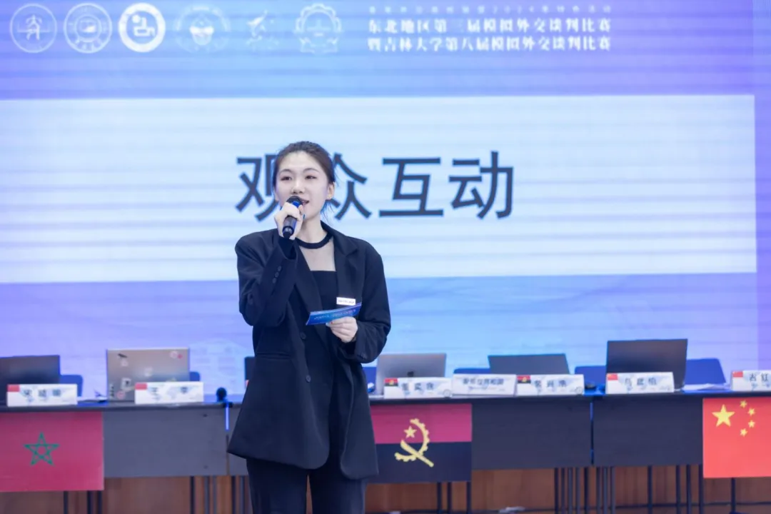 在接下来的谈判比赛中,各校谈判官坚定捍卫己方立场,凭借扎实的专业素养和精湛的谈判技巧,就中非经济合作议题进行了深入讨论;新闻官们在新闻发布会环节机智应对,坚守国家立场,以出色的临场反应能力纵横捭阖,代表本国人民发声;场下记者思维敏捷,提问一针见血。比赛期间的精彩较量和交流充分展示了青年学生对国家安全战略规划的明确把握与深刻理解,以及他们的政治素养、全球视野、责任担当。观众们目睹了非军事领域的国家博弈,也领略了参赛选手们的卓越风采与外交外事工作的独特魅力。此外,观众们热情参与了知识问答和随机抽奖等互动环节,为紧张的谈判氛围增添了一丝轻松和乐趣。