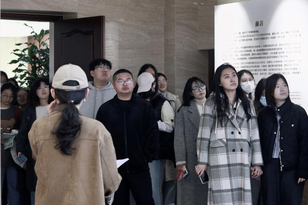 伴随着校歌悠扬激荡的旋律,同学们穿越“时空隧道”,开始了他们对“青春向北,吉人天下”精神的探索之旅。走过“光辉岁月”“继往开来”“星光璀璨”“杏坛翘楚”“芝兰玉树”等一系列展区,同学们了解了学校在不同历史时期的重大事件和杰出成就。作为中国共产党在祖国北疆亲手创建的重点综合类大学,吉林大学一直在党旗的引领下不断向前。展厅内陈列的丰富图片、实物和文献资料,见证了吉林大学艰苦创业的办学历史,再现了建校先贤们播撒科学和人文火种的历史往事,更展现了吉林大学以追求真理、培育人才、研究学术、传承文明、服务社会、造福人类为己任的办学精神。