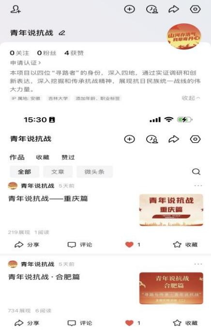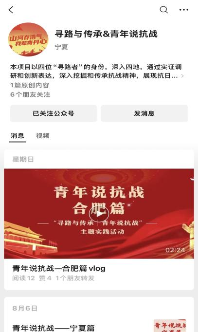 余米、胡月茹、夏欣悦、马楚涵四名同学于暑假期间发起“寻路与传承——青年说抗战”社会实践主题活动,返乡走访抗战遗址,对当地的抗战事迹进行调研整理,合作形成图文、视频等系列宣传内容,发布于微信公众号、今日头条、小红书、抖音等媒体平台。
